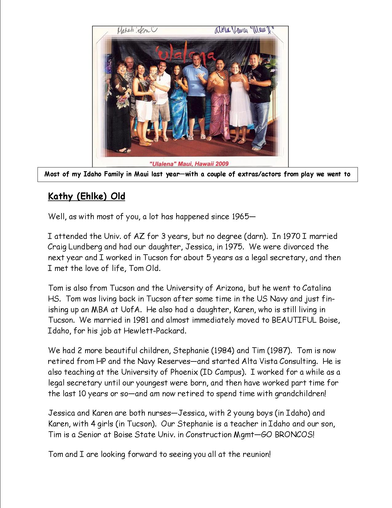 We have 3 grown children who live close by. Our oldest son, Brent, is a professional photographer. He graduated from Brooks Institute in Santa Barbara. I can't ever get him to take a family picture-this year for sure will be the year. He has an 11year old daughter. Alicia is a speech pathologist specializing in children with Autism,who now stays at home with her 2 kids-3 and 4. Our youngest, Michael is a mailman, and has a son who is almost 3. We sure do enjoy them. Dick works with his brother as grading contractors. I work in education and am a job developer for our school district. I work with all the special education students. I develop partnerships with businesses who hire our students. Very rewarding! Our lives changed dramarically in 2001 when I was diagnosed with Chronic Lymphocytic Leukemia. Your life can change in the blink of an eye! I am currently in remission. Since then, Dick and I have become involved in Leukemia/Lymphoma Society's Team in Training. We fundraise to help find a cure for blood cancers. Dick has ridden 4 century(100 miles) rides around Lake Tahoe, to name a few. Off he goes every Saturday on his bike. I have been asked this year to be the honoree for the Walk Team. I am training to walk a the PF Chang's Rock N Roll Marathon in Phoenix in January. My daughter will run the half. I train with a wonderful group of women every Saturday as well. He goes one way, I go the other, then home to the couch. We count our blessings every day and look forward to seeing everybody. |