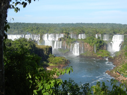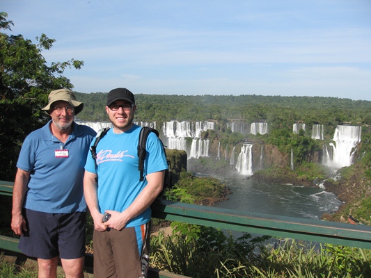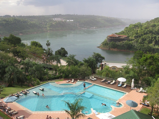 This is the view from our hotel room in Iguazu, Argentina. The hotel is in Argentina, the land mass just to the upper left is Paraguay and the land mass to the upper right is Brazil. |